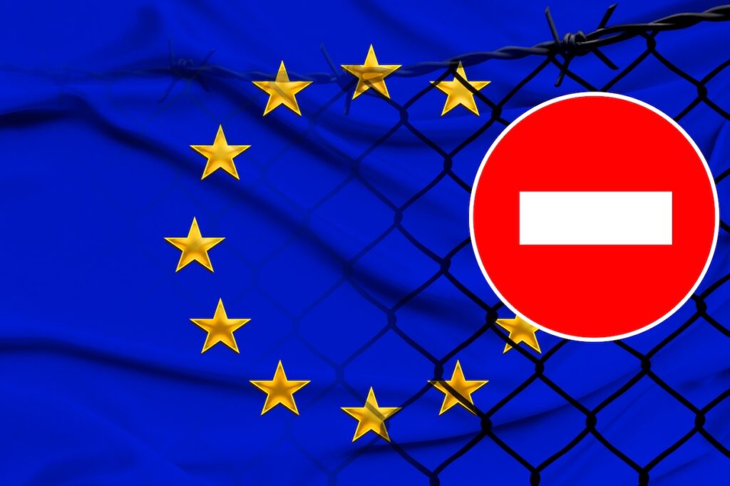 France confirms readiness for the EU’s new Entry/Exit System, bringing facial scans, fingerprint checks, and longer waits for British travellers from October. EU flag behind barbed wire with “No Entry” sign symbolising new EU border checks at Dover, highlighting upcoming travel restrictions, passport scans, and autumn delays for British travellers. Credit: Kittyfly, Shutterstock