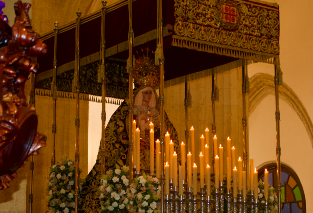 Devotees often walk barefoot behind the paso or carry crosses and candles, fulfilling personal vows made to the Virgin. Photo credit: Molly Grace