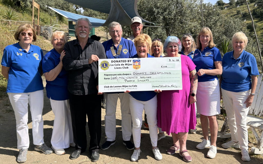 Community spirit shone brightly in Mijas on Friday, April 3, when volunteers from La Cala de Mijas Lions Club joined forces with the Phoenix Singers to present two huge cheques at Donkey Dreamland sanctuary near La Cala de Mijas.