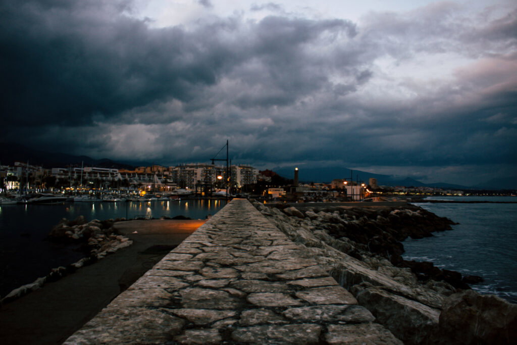 Storm clouds gather over Estepona harbour. Credit: Ekaterina Chuyko - Estepona